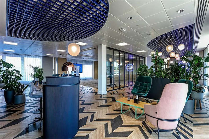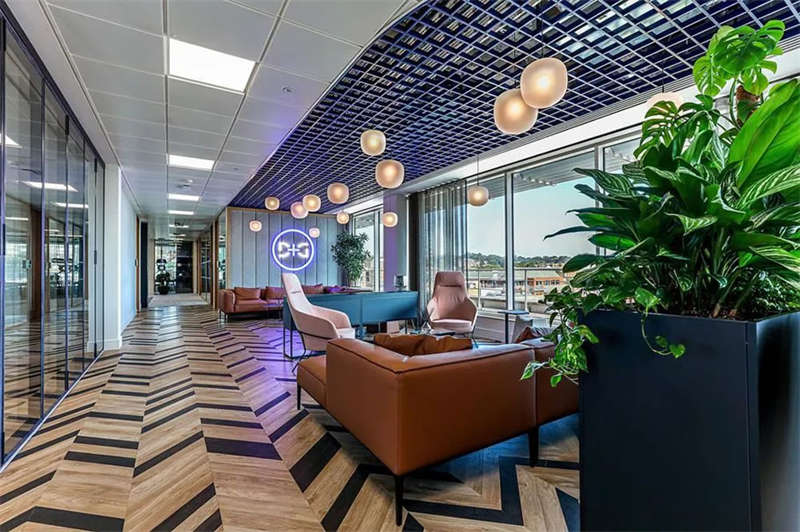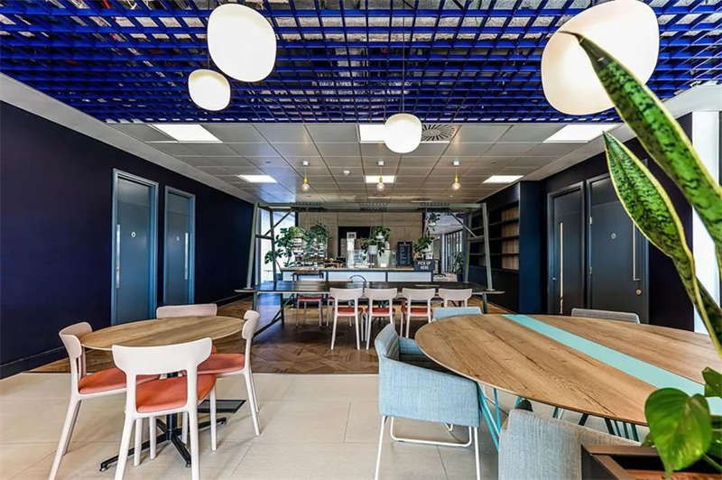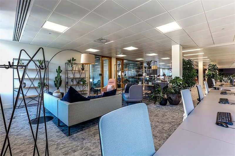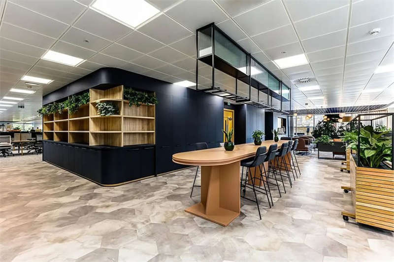 此番改造的一個重要主因是給到員工愿意回歸辦公室的理由。這意味著提升整體設(shè)施的實用性和美觀性,同時增加協(xié)作空間并整合遠程工作人員的需求。因此對當(dāng)代前沿科技的投資成為關(guān)鍵要素。為了支持混合工作模式,設(shè)計公司在早期就任命了一名AV專家,以便可以通過應(yīng)用程序或基于桌面的預(yù)訂系統(tǒng)預(yù)訂工作空間。同時,傳統(tǒng)工作站與可替代工作設(shè)施之間的界限也進一步擴大,平均(NIA室內(nèi)凈面積)比率為1:10。此外,之前辦公桌與員工1:1的比例也被新的1:1.6比例所取代。