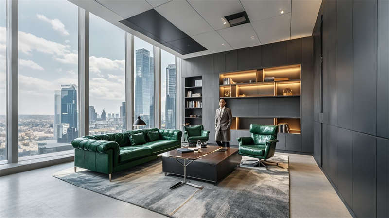 色彩體系以冷灰為主基調(diào),局部運(yùn)用墨綠、深藍(lán)跳色,通過絨面、金屬、玻璃不同材質(zhì)的反射與漫射形成豐富層次??臻g規(guī)劃注重功能性延展,會議室配置可移動隔斷系統(tǒng),實(shí)現(xiàn) 4 種空間組合形態(tài)。員工休憩區(qū)創(chuàng)新采用垂直綠植墻結(jié)合智能新風(fēng),PM2.5 實(shí)時(shí)監(jiān)測顯示系統(tǒng)保障健康環(huán)境。