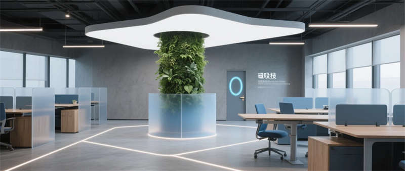 本項目以“未來生態(tài)辦公”為核心理念,打造1200㎡科技與自然交融的創(chuàng)新型辦公空間。設計采用啞光太空灰為主基調(diào),通過霧霾藍企業(yè)色與原木紋理的碰撞,在冷峻科技感中注入人文溫度??臻g以微水泥地面為基底,貫穿透光亞克力與陽極氧化鋁材質(zhì),配合隱藏式線性燈帶的流動光影,構(gòu)建出具有呼吸感的數(shù)字美學場域。
