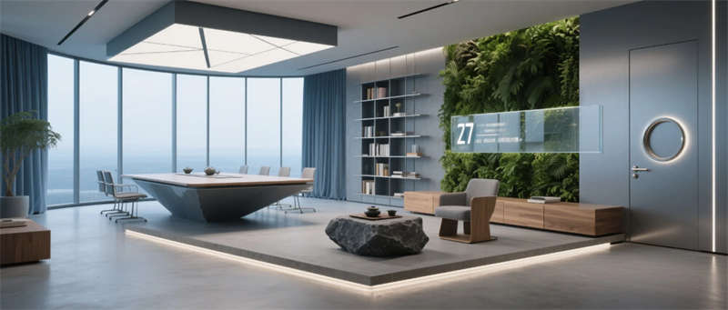 入口大廳以8米寬LED弧形屏呈現(xiàn)動態(tài)視覺沖擊,懸浮曲面黑巖板前臺與天花垂墜的3D打印樹脂裝置形成虛實對話;開放式辦公區(qū)通過模塊化磁吸工位與中央綠植柱,實現(xiàn)靈活協(xié)作與生態(tài)療愈的平衡;總裁辦公室270°全景落地窗搭配懸浮會議島,幾何切割天花與火山石茶臺演繹力量與自然的共生哲學。