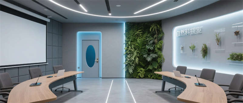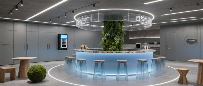 各區(qū)域通過四大統(tǒng)一性語言緊密串聯(lián):霧霾藍橢圓金屬門把手貫穿全空間,再生材料家具呼應可持續(xù)發(fā)展理念,聲學墻面嵌入本地植物標本強化生態(tài)屬性,智能燈光系統(tǒng)則通過4000K色溫線性燈帶實現(xiàn)晝夜場景的無縫切換。特別設計的全息投影展廳與智能階梯會議室,通過LED交互地屏與AR懸浮展臺,將品牌科技基因融入空間體驗。