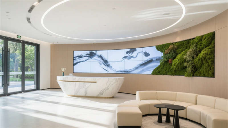 智能接待廳以流動(dòng)數(shù)字藝術(shù)傳遞先鋒調(diào)性,而健康茶水間則通過有機(jī)材質(zhì)與綠植裝置,構(gòu)建松弛有度的能量補(bǔ)給站。整體空間拒絕刻板分割,家具模塊可隨需求自由重組,金屬線條與低飽和色彩在自然光照下沉淀出理性而溫潤(rùn)的質(zhì)感。