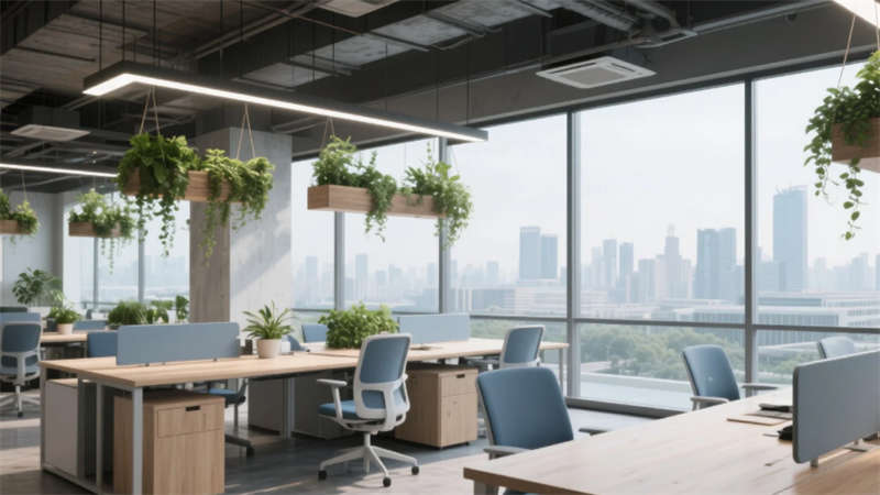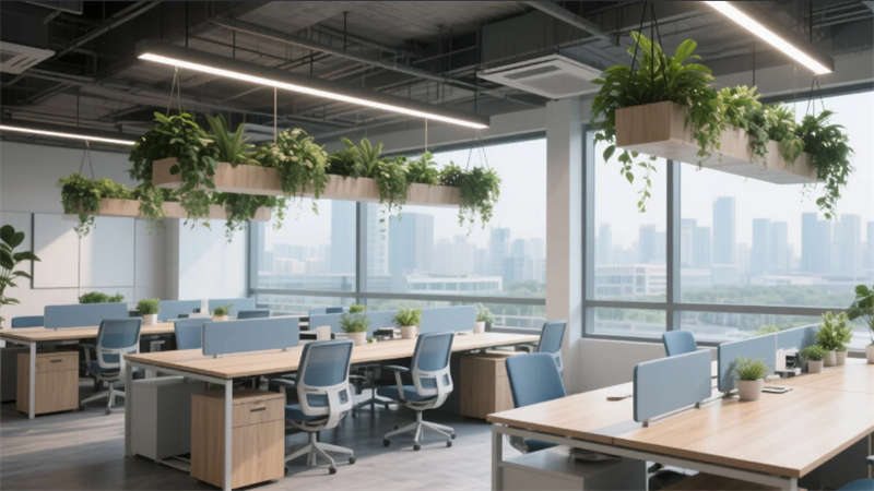 該辦公空間以"自然共生"為核心理念,將科技感與人文溫度融入兩千平米的開(kāi)放場(chǎng)域。流動(dòng)的淺木色調(diào)貫穿始終,啞光金屬與微水泥形成質(zhì)感對(duì)話(huà),模塊化家具構(gòu)建靈活場(chǎng)景。綠植生態(tài)系統(tǒng)從空中吊籃蔓延至苔蘚墻面,模糊室內(nèi)外界限。