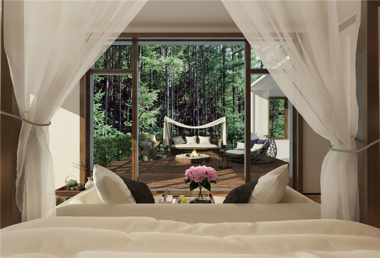 本案度假酒店設(shè)計(jì)依山傍水,設(shè)計(jì)師在規(guī)劃時(shí),充分考慮到自然環(huán)境帶給酒店的附加值。設(shè)計(jì)方案時(shí),設(shè)計(jì)師就將部分功能區(qū)規(guī)劃到室外露天場(chǎng)地,當(dāng)然在室內(nèi)設(shè)計(jì)中也充分利用了自然采光的設(shè)計(jì)手法,讓整個(gè)度假酒店與自然環(huán)境融為一體。