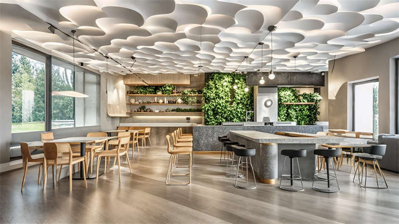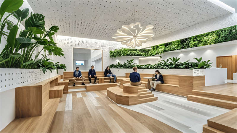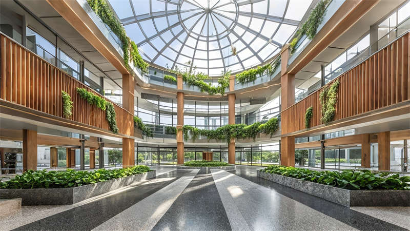 1)中庭三層挑空綠植墻構建垂直生態(tài)系統(tǒng),改善室內空氣質量;
