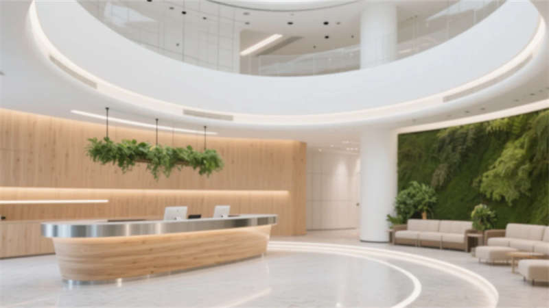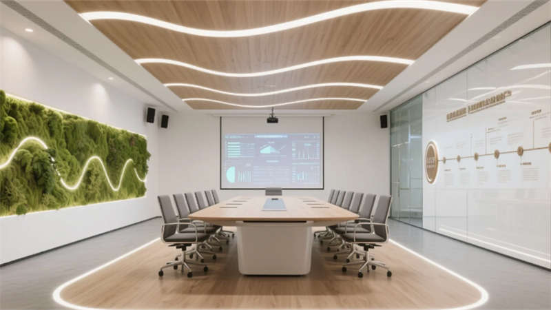 生態(tài)科技體系覆蓋全場景:經(jīng)理辦公室苔蘚墻集成空氣監(jiān)測系統(tǒng),總裁室霧化玻璃聯(lián)動光伏發(fā)電,小會議室綠植墻搭載微滴灌節(jié)水裝置。材質(zhì)選用安徽本土元素升級再造,大廳水磨石摻入大別山礦石粉,定制地毯紋樣提取徽派窗欞數(shù)字化變體。