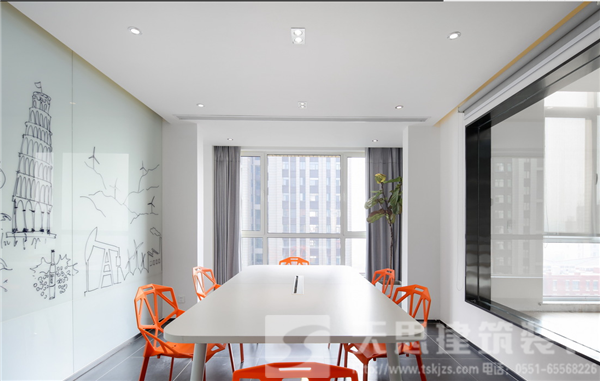鋼化玻璃、仿木紋瓷磚、布藝窗簾、辦公隔斷