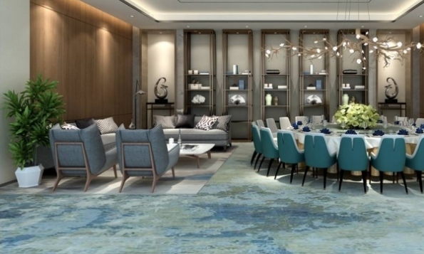 主體的圓形餐桌上懸掛的是一盞仿生吊燈,隨枝干散發(fā)開去的白色燈盞猶如悄然開放的花朵,為整個空間提供一種溫馨而典雅的就餐環(huán)境。同時,在餐桌椅上大膽地使用了青藍(lán)色,熟悉中國畫的人也許一眼就看出了設(shè)計的用意:青藍(lán)是國畫中較為常見的一種大面積使用的色塊,更常見于山水畫當(dāng)中。
