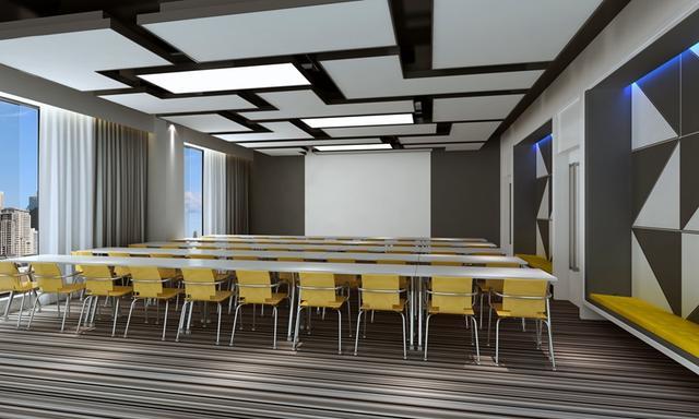 干凈硬朗的員工培訓(xùn)室設(shè)計(jì),符合這個(gè)功能區(qū)緊張而又嚴(yán)肅的工作氛圍。右側(cè)設(shè)置有休閑區(qū),搭配幾何造型的立面設(shè)計(jì),可以達(dá)到調(diào)節(jié)工作節(jié)奏的效果。