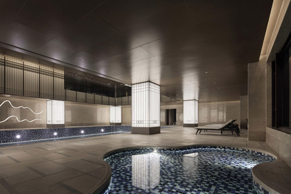 細致的從空間注入圓、點、線,繁縟而有節(jié)配上雅致玻璃吊飾,自然光映出流光溢彩,水的意象呈現(xiàn)東方肌理,光影交織突顯五重院落的建筑,彰顯東方大境。