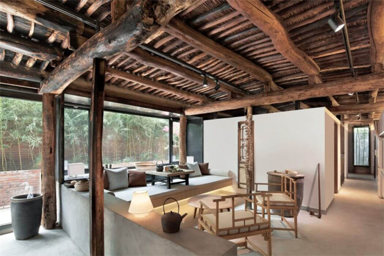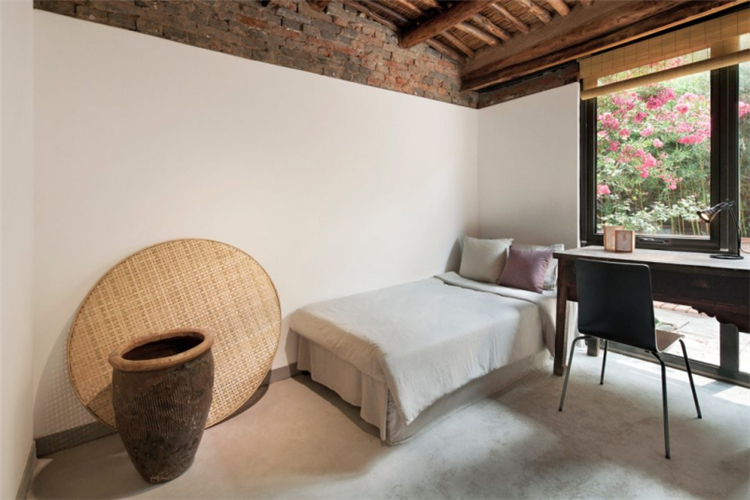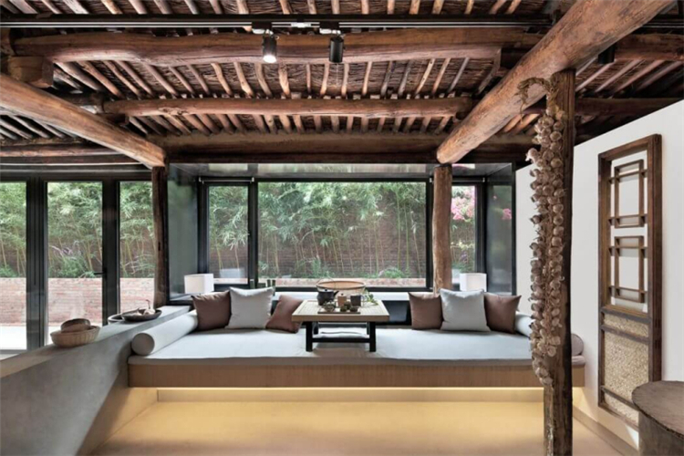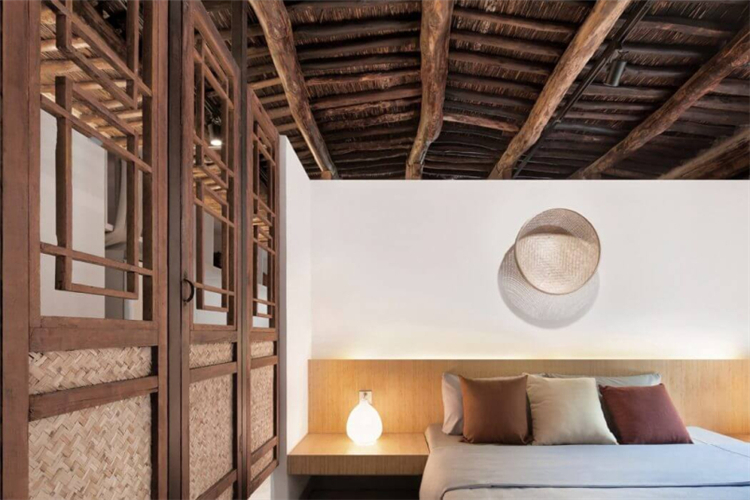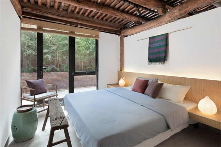 而我們在這次的民宿的功能布局方面,我們根據(jù)與居民的詳細溝通,了解他們的日常生活和習(xí)慣,進行調(diào)整,重新組織平面圖。在我們拆除吊頂后,更多的空間被釋放,原始的木結(jié)構(gòu)和稻草覆蓋的天花板紋理終于顯露出來,講述了一個時間的故事。在現(xiàn)場勘察過程中,我們在建筑物西側(cè)和鄰近墻壁之間發(fā)現(xiàn)了一條約80厘米寬的狹窄通道。因此,我們在走廊盡頭向西側(cè)設(shè)計了一個觀景窗。在窗外,擺動的竹影有助于將室內(nèi)空間與自然環(huán)境相連。