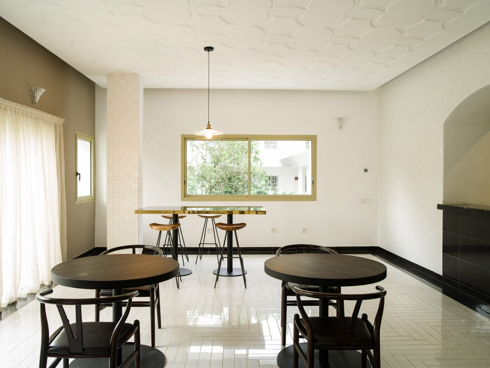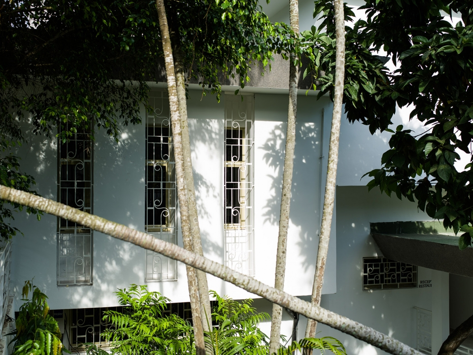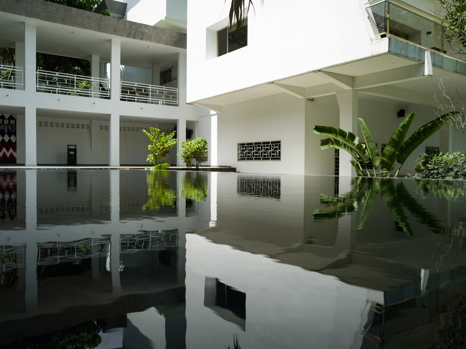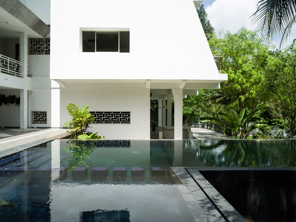 酒店外觀局部,建筑在泳池中投下倒影,部分外部視圖,池反射建筑物。健身房和養(yǎng)生區(qū)位于原建筑的廚房處,擁有良好的自然通風(fēng)以及朝向。游泳池又長又窄,客人們可以在其中進(jìn)行來回往復(fù)式的游泳運動,同時還在炎炎夏日里為客人們提供了一個消暑空間,當(dāng)?shù)貥淠镜娜~子和開花植物則為泳池空間提供了遮陰處和裝飾。