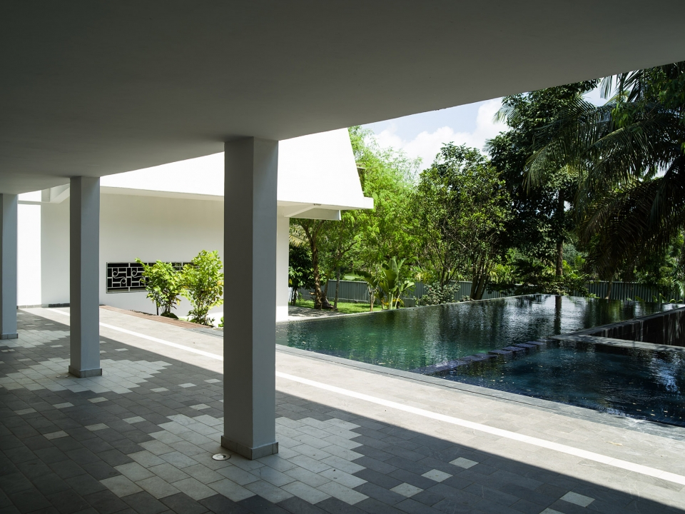 站在走廊上看泳池,室外狹長的泳池,棕櫚樹蔭提供了遮陽空間?;▓@也充滿了自然的意趣,給人一種放松之感,建筑師還在花園的地面上鋪設(shè)了新的灰白兩色圖案的地板,不僅在室外空間中創(chuàng)造了一種視覺聯(lián)系,更是將室外空間統(tǒng)一了起來。