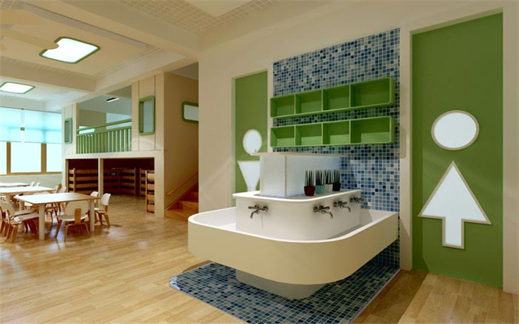 洗手區(qū)域的設(shè)計(jì):此處通往的是就餐區(qū),在洗手池的設(shè)計(jì)上,設(shè)計(jì)師對(duì)地面、洗手池都做了處理,目的就是為了避免因?yàn)樗斐傻牡孛鏉窕?,兩個(gè)門(mén)一個(gè)進(jìn)一個(gè)出,設(shè)計(jì)是希望可以從小培養(yǎng)孩子排隊(duì)的意識(shí),一進(jìn)一出之間也見(jiàn)證了教育的重要性。