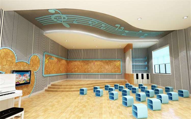 音樂(lè)教室的設(shè)計(jì):這里大致可以容納下30多個(gè)小朋友,也就是大概一個(gè)班多一點(diǎn)點(diǎn),能歌善舞是每個(gè)家長(zhǎng)對(duì)于孩子的特殊期望,對(duì)于孩子本身來(lái)說(shuō)也是一個(gè)不可不得的技能,在設(shè)計(jì)師看來(lái)若是引導(dǎo)得當(dāng),讓孩子喜歡唱歌、跳舞也不失為一件功德無(wú)量的事情。