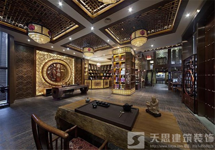古典中式裝修茶樓會所大廳設計溫馨寬敞散發(fā)著獨特的茶文化,整齊有序紅木茶展柜色澤渾厚且秀麗透亮,嵌入式方格天花吊燈搭配現代感極強的紅木圈椅含蓄而內在,泡一杯清茶,品味葉的裊娜,水的清澈,便有了清風自來的心爽。