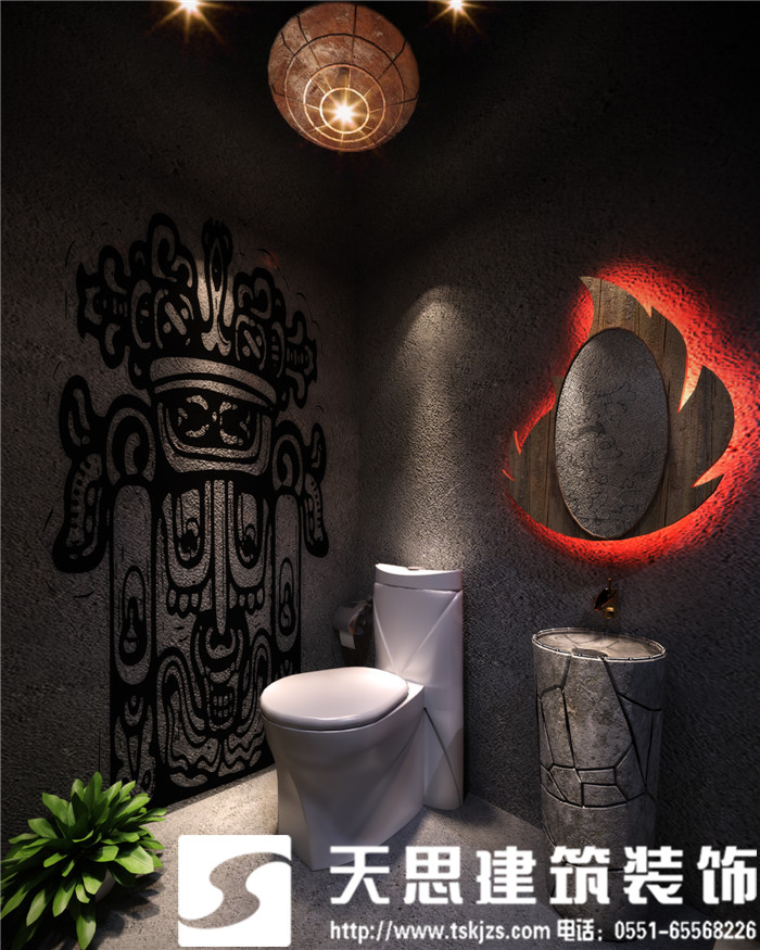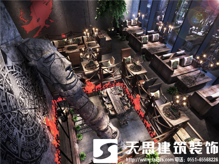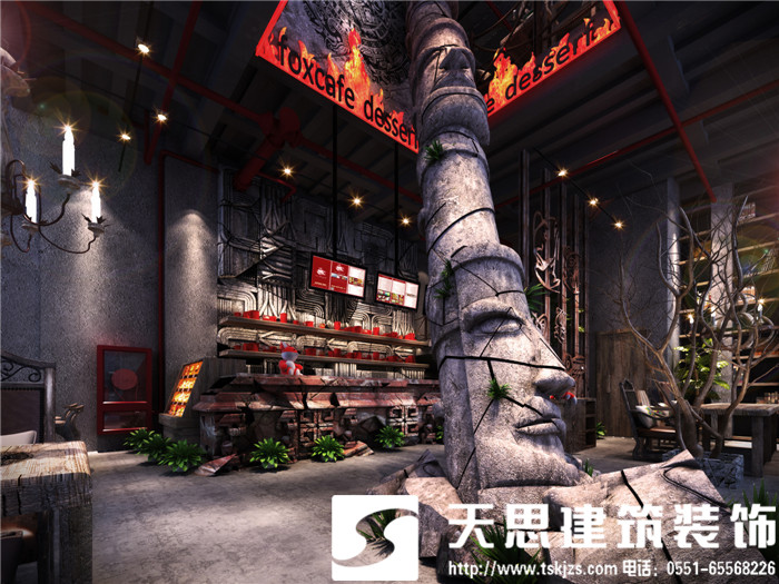 此案運(yùn)用破碎的瑪雅建筑紋理作為主元素貫穿整體空間設(shè)計(jì),將消失的瑪雅文化融入到設(shè)計(jì)風(fēng)格里,用藝術(shù)化自然化的設(shè)計(jì)手法將簡陋的空間置換為國際潮流空間設(shè)計(jì)風(fēng)尚。僅用一根從底層直穿二樓的人面雕塑就巧妙規(guī)避了空間的局促感,成為整體空間設(shè)計(jì)最凝練的一筆。整體空間基調(diào)沉穩(wěn),清水混凝土、石頭以及原木都為統(tǒng)一的暗色系,為了突出火狐的特色,將紅色引入空間,不僅活躍了空間,也讓品牌形象悄然流露。