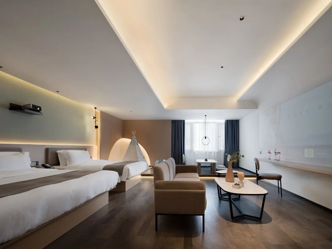 在線條曲度與建筑結(jié)構(gòu)的銜接中交融出感性層面的驚喜,令入住者“循著光”下榻酒店,在體驗(yàn)與感受中為空間注入當(dāng)下的即時(shí)形態(tài),由此,人在空間里是造訪者亦是著境者,是觀賞者,亦是參與者。情與境中,無(wú)盡遐思。