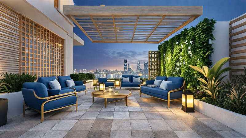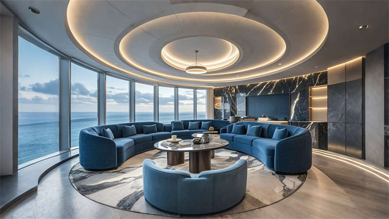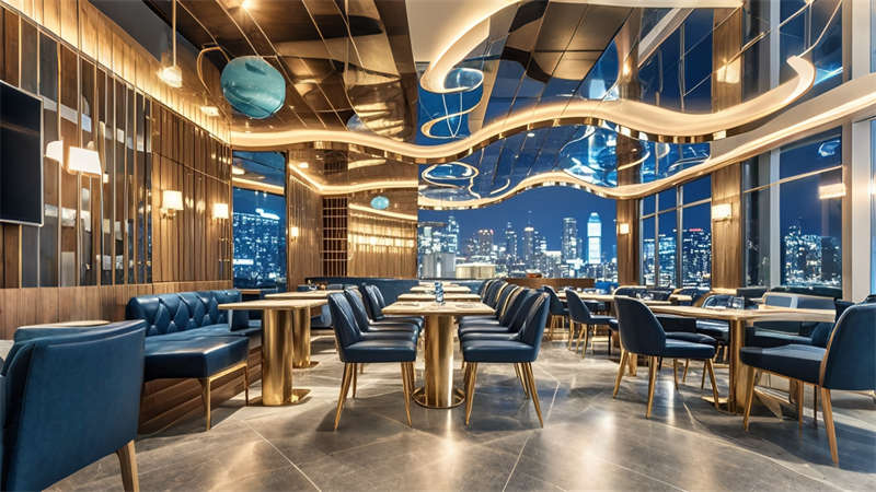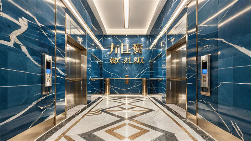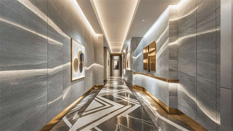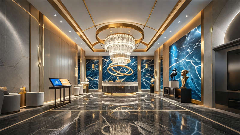 色彩體系以香檳金與深海藍(lán)為主調(diào),大堂采用香檳金金屬線條勾勒建筑肌理,搭配深海藍(lán)大理石營造視覺重心。客房區(qū)運(yùn)用暖灰硬包墻面平衡色彩強(qiáng)度,通過2700K暖光與4000K中性光分區(qū)照明塑造晝夜場景。材質(zhì)組合注重層次:大理石地面、金屬構(gòu)件、絨布軟包形成質(zhì)感三部曲。