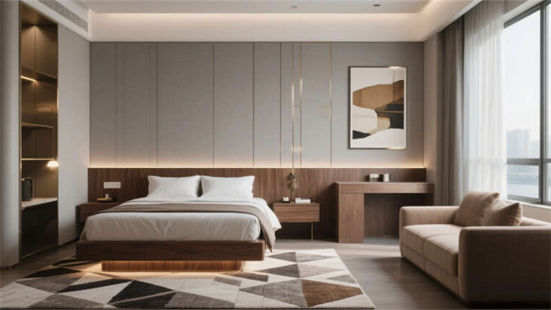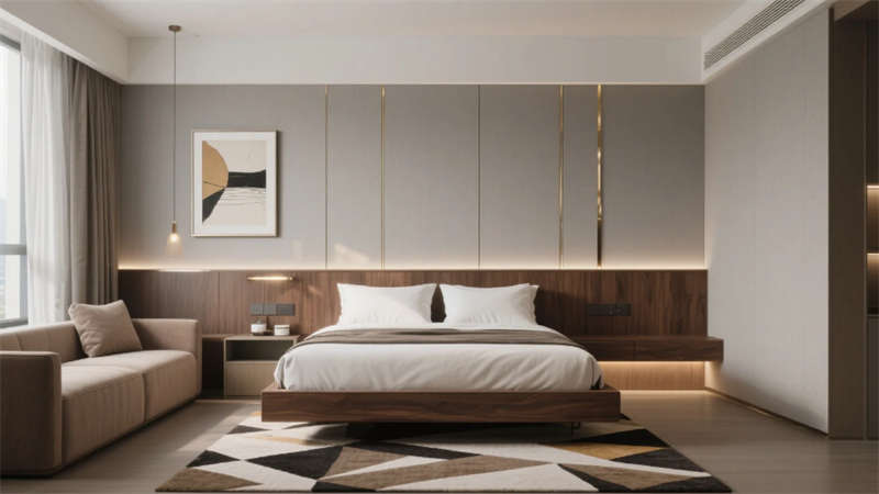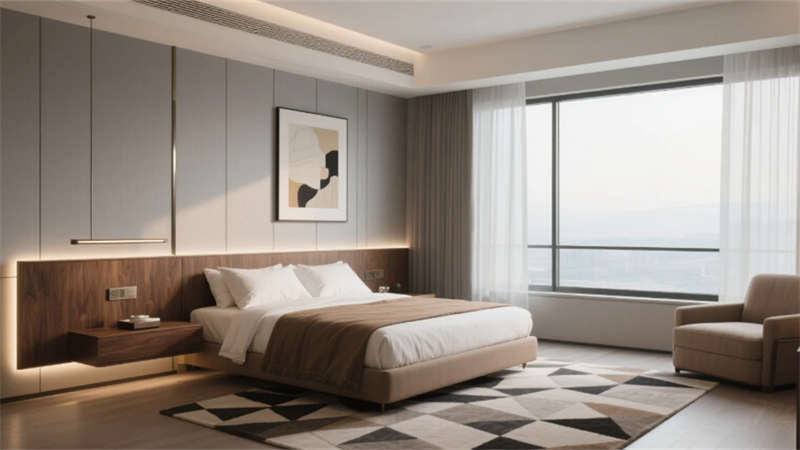 以低飽和度中性色調(diào)為基底,這座酒店將現(xiàn)代輕奢美學(xué)與在地文化氣韻悄然相融。空間以胡桃木的溫潤、金屬線條的利落與自然光影的詩意共筑視覺語言,藝術(shù)裝置如隱形的敘事者串聯(lián)起流動的場域精神。