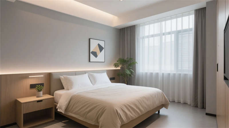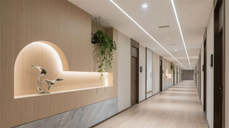 酒店以現(xiàn)代簡約美學(xué)貫穿始終,走廊作為串聯(lián)各區(qū)域的紐帶,延續(xù)了整體的設(shè)計(jì)語言?;⌒伪邶惻c懸浮天花板的線性燈光,柔和地引導(dǎo)動(dòng)線,淺木飾面與石材的碰撞在低調(diào)中彰顯質(zhì)感。壁龕內(nèi)的藝術(shù)擺件與垂墜綠植,將自然氣息融入過渡空間,打破傳統(tǒng)走廊的單調(diào)感。