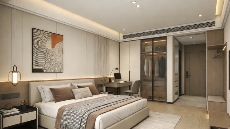 本方案專為合肥本地酒店量身打造,深度融合皖韻文化與現(xiàn)代設(shè)計美學(xué),覆蓋外觀、大堂、走廊、雙床房、兩間特色大床房、衛(wèi)生間及會議室八大核心空間。外觀以簡約大氣的線條為基礎(chǔ),嵌入徽派建筑標(biāo)志性的馬頭墻元素與落地玻璃,實現(xiàn)采光與地域辨識度的雙重提升。大堂采用挑高設(shè)計,搭配淺灰石材地面與原木裝飾,前臺背景墻融入巢湖風(fēng)光元素,營造開闊舒適的接待氛圍??头糠謪^(qū)明確,大床房1側(cè)重溫馨靜謐,搭配暖光照明與定制軟裝;大床房2主打商務(wù)簡約,增設(shè)多功能辦公區(qū);雙床房注重空間利用率,保障賓客隱私。衛(wèi)生間采用干濕分離設(shè)計,搭配防霧鏡與智能衛(wèi)浴設(shè)備,提升便捷性。會議室配備高清投影與專業(yè)聲學(xué)系統(tǒng),可滿足商務(wù)洽談、小型發(fā)布會等多元需求。整體設(shè)計兼顧美觀性與實用性,既契合合肥文旅發(fā)展趨勢,又能精準(zhǔn)匹配商務(wù)、旅游等不同客群需求,助力酒店提升核心競爭力。
