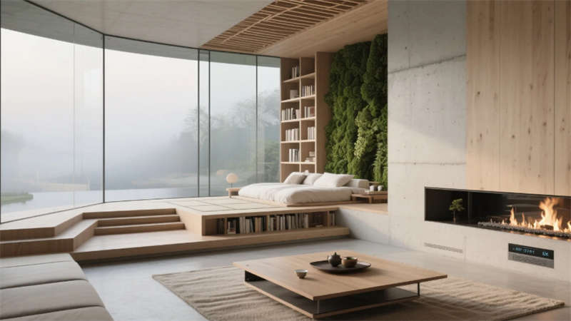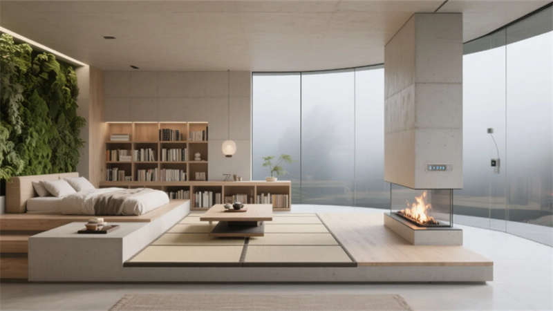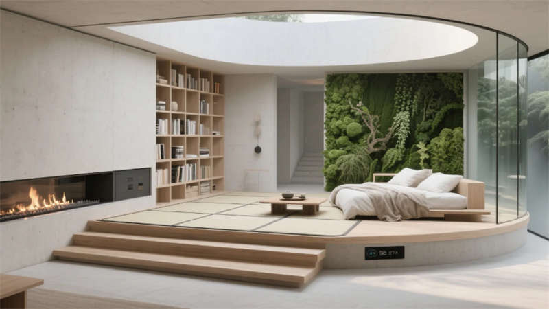 客房以極簡(jiǎn)的智慧回應(yīng)棲居本質(zhì)。榻榻米地臺(tái)消弭床與地面的界限,270°環(huán)景霧化玻璃輕觸即透,仿生綠植在智能光影中呼吸生長(zhǎng),隱藏式投影幕布落下時(shí),星空與林海皆成私享背景。階梯書(shū)吧的垂直綠植墻下,模塊化沙發(fā)隨需求自由組合,全息粒子在空氣中勾勒出流動(dòng)的藝術(shù),而巖板中島餐廳里,藤編座椅與吊燈矩陣的光暈交織,智能調(diào)光天窗讓每一餐都浸染著天光的溫度。