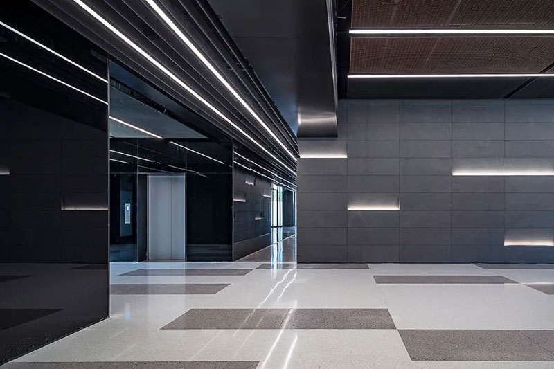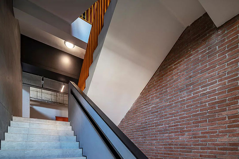 室內(nèi)空間造型多以棱角分明的幾何形體為主,減少裝飾類細(xì)部,鐵銹褐、水泥灰、煙熏黑等暗冷色調(diào)元素交織在一起。局部通過紅磚作為點綴,減少淺色系材質(zhì)的使用,讓自然光線將空間變得更有質(zhì)感。