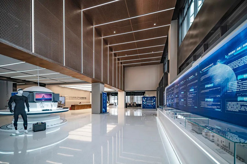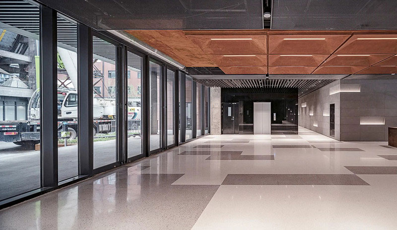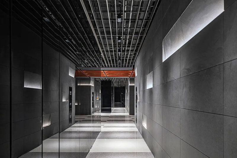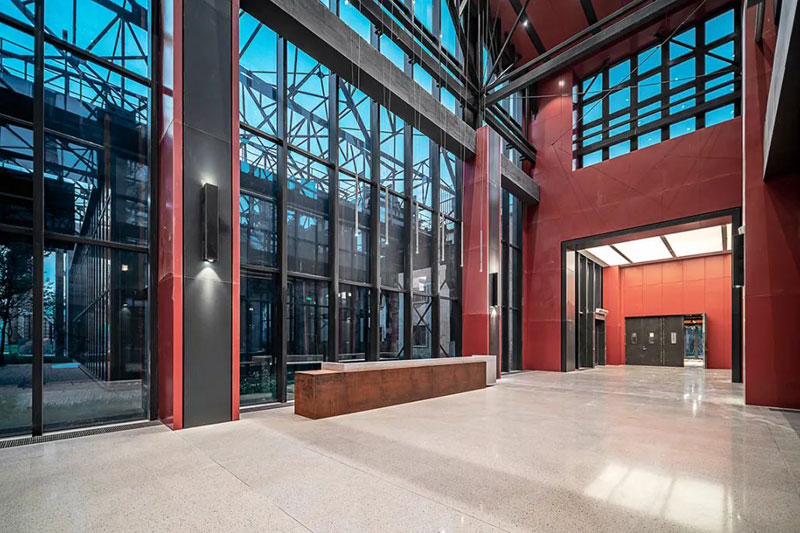 低飽和度紅色鋼板與黑色鋼板形成視覺碰撞,銹板前臺、懸浮燈飾與金屬結(jié)構(gòu)架讓空間闊達簡練,通高的玻璃幕墻借景舊建筑的殘影,使之成為室內(nèi)裝飾的一部分。