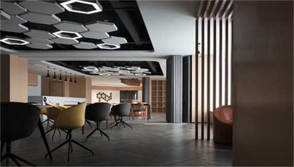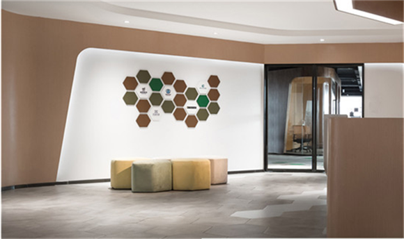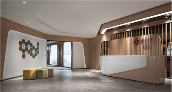 通過空間調(diào)度,模糊各個工作區(qū)域間的界限,打造既開放、又不乏私密性的辦公區(qū)。除此之外,曲線與直線在空間共存,線條的形式感使辦公室充滿現(xiàn)代化與創(chuàng)意十足,極大的在視覺上滿足了客戶的營銷訴求,構(gòu)建來人第一感性認知。