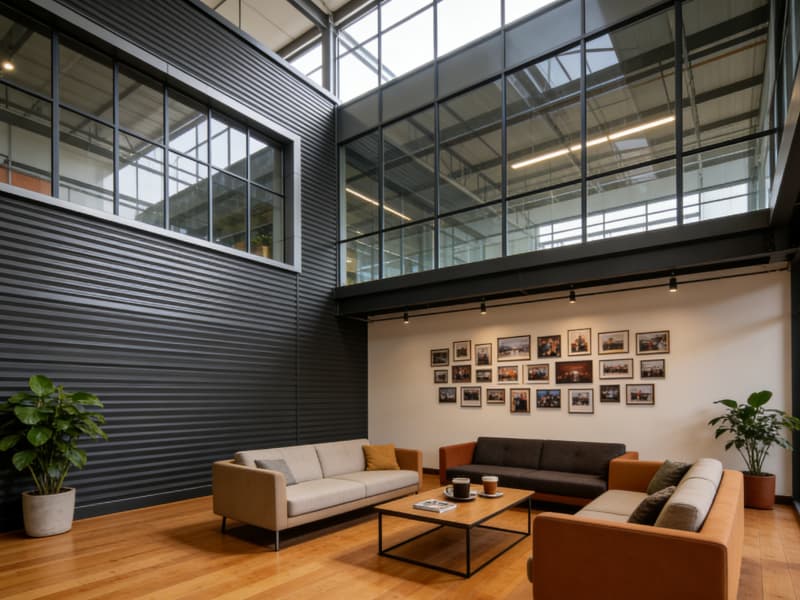 進(jìn)入廠房?jī)?nèi)部,生產(chǎn)區(qū)域挑高設(shè)計(jì),空間開闊,頂部的桁架結(jié)構(gòu)裸露在外,搭配軌道式吊燈,營(yíng)造出強(qiáng)烈的工業(yè)氛圍。地面選用耐磨的金剛砂地坪,承載能力強(qiáng)且便于清潔,滿足高強(qiáng)度生產(chǎn)需求。