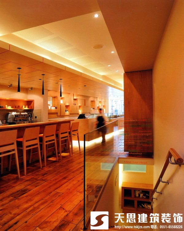 店鋪后部特別定制的玻璃吊燈象征著可可豆的豆莢。其他的設(shè)計(jì)元素包括回收的松木地板、石灰石柜臺(tái)和臺(tái)面、鮮橙色皮革、橡木制品以及長條噴漆天花板。北京餐廳設(shè)計(jì)師在處理天花板時(shí),將不同的元素統(tǒng)一在一起,突出了空間的長度并將人們的眼球吸引到店鋪后部。地下室主要是用來展示的廚房,里面設(shè)置著巧克力制作課程和工坊。