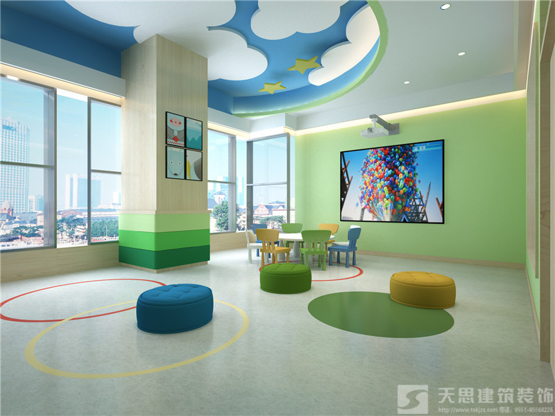 一般都是選擇卡通式的裝修,采用不同靚麗顏色的搭配,還有簡(jiǎn)單的娛樂(lè)設(shè)施。不能選擇太暗的顏色或者非常刺眼的顏色,不然會(huì)對(duì)孩子的眼睛造成傷害,一般都是以暖色調(diào)來(lái)搭配,比如粉色、淺藍(lán)色、暖黃色或者淺綠色。