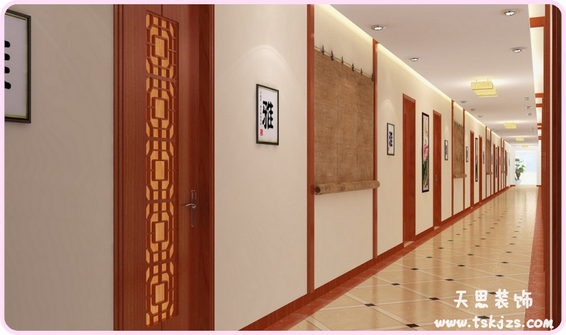 走廊是室內(nèi)流通空間的主要部分,其空間特點(diǎn)是狹長,且缺少變化,人在這種空間中容易產(chǎn)生單調(diào)感。因此,在設(shè)計(jì)上應(yīng)做一定的藝術(shù)處理。使其既不能過于華麗、復(fù)雜,也不宜過于簡單、呆板、應(yīng)在墻壁上做一定的裝飾點(diǎn)綴。如做出口線、偏倚柱、外門套和墻壁裝飾線條的藝術(shù)處理,以及字畫或燈光的點(diǎn)綴。在特殊功能區(qū)的路段,可以做色彩變化或不同的裝飾處理,從而形成 統(tǒng)一中有變化的視覺效果。在通常情況下,走廊的設(shè)計(jì)要求是:應(yīng)有充足的光照度、統(tǒng)一和諧的界面裝飾,清新淡雅的色調(diào)和明確的導(dǎo)向指示。