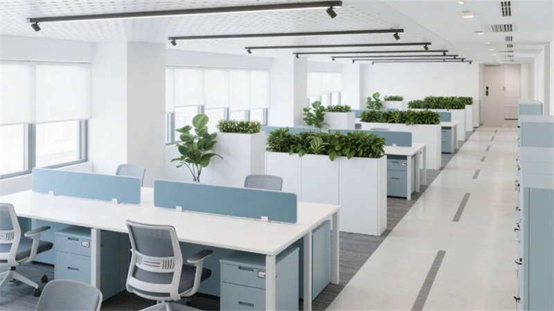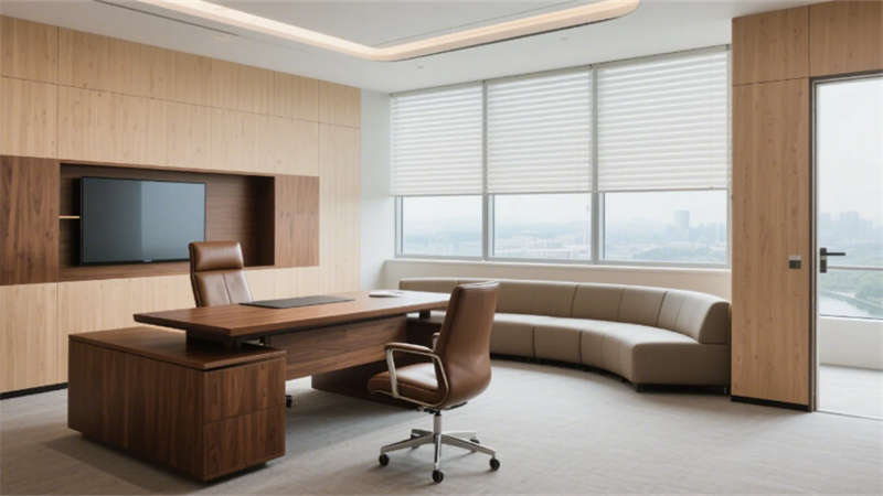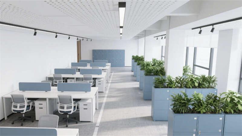 室內(nèi)空間強(qiáng)調(diào)功能與美學(xué)的平衡:入口大堂通過12米挑高藝術(shù)玻璃墻與企業(yè)色燈光系統(tǒng),構(gòu)建極具辨識度的第一視覺;開放式辦公區(qū)以模塊化工位、綠植隔斷及通透采光優(yōu)化協(xié)作效率;高管辦公室與會議空間則運(yùn)用木飾面、吸音材質(zhì)及智能設(shè)備,兼顧私密性與科技感。全案貫穿暖灰主色調(diào),局部以藍(lán)、橙跳色激活空間活力,啞光金屬、線性燈光與天然材質(zhì)碰撞,營造理性而不失溫度的氛圍。