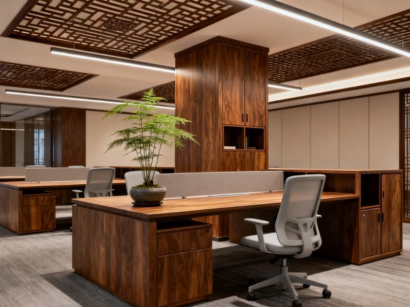 空間布局上,科學(xué)劃分開(kāi)放辦公區(qū)、獨(dú)立辦公室、會(huì)議室、休閑區(qū)等功能區(qū)域,優(yōu)化動(dòng)線設(shè)計(jì),保證辦公效率與使用舒適度。色彩以淺色系為基底,搭配深棕色實(shí)木元素,營(yíng)造雅致、沉穩(wěn)的視覺(jué)效果,同時(shí)通過(guò)落地玻璃窗、中式格柵吊燈等設(shè)計(jì)引入充足自然光線,減少空間壓抑感。