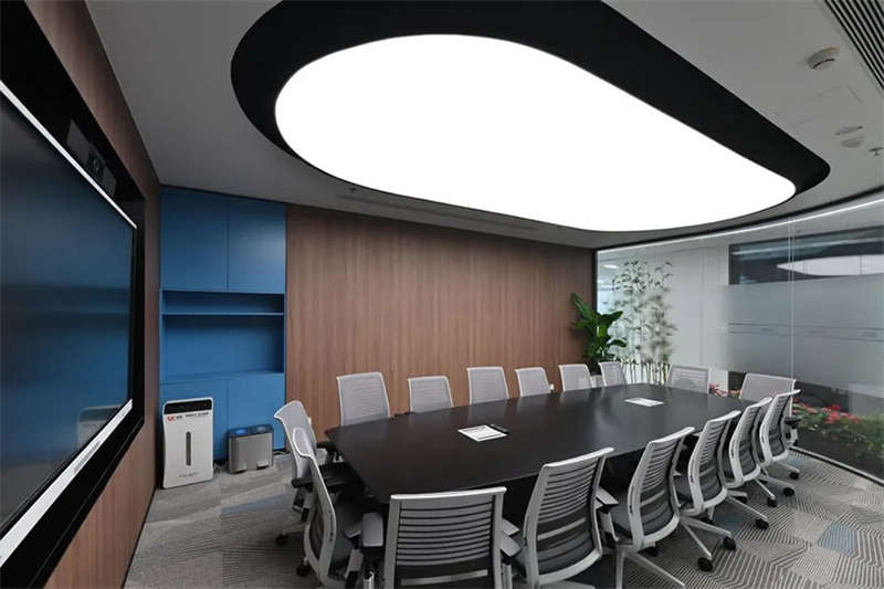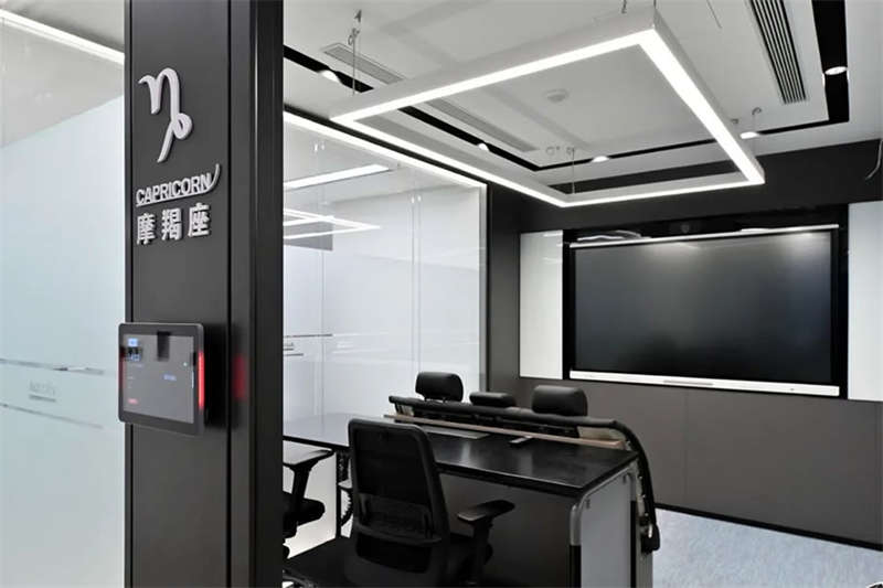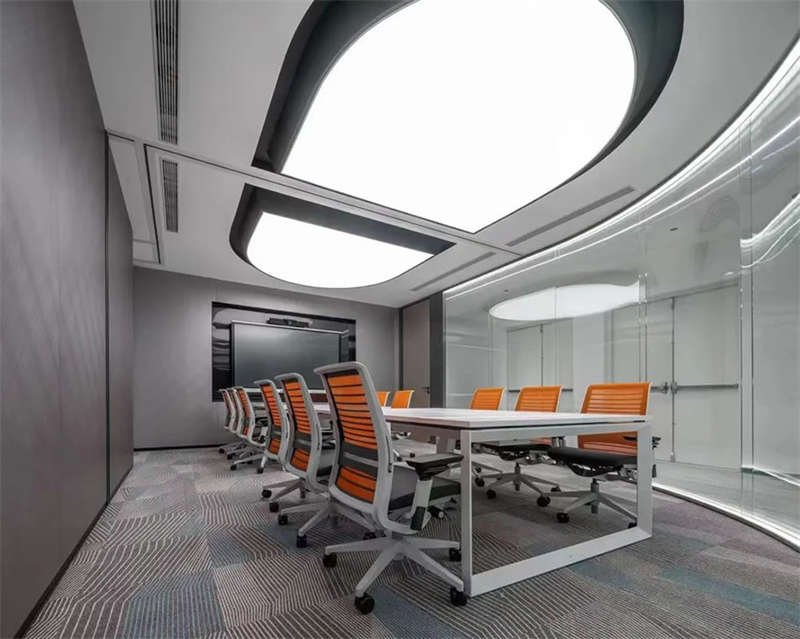 在接待前廳左右兩邊各設(shè)置了一個(gè)大會(huì)議室,其中一個(gè)是現(xiàn)代酷灰的可二合一的會(huì)議室,另一個(gè)是穩(wěn)重優(yōu)雅的行政會(huì)議室。感謝成品隔斷供應(yīng)商卡萊斯卓的緊密配合和支持,在設(shè)計(jì)師的要求下,把LED燈帶嵌入了雙層玻璃隔斷中。讓整個(gè)會(huì)議室區(qū)域看上去充滿(mǎn)科技感!
