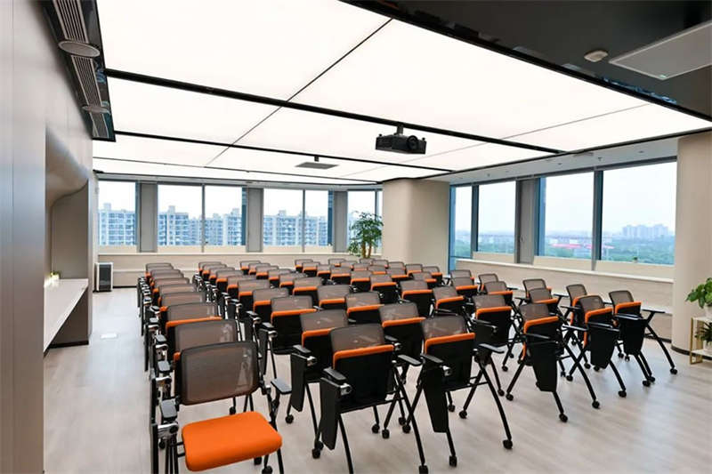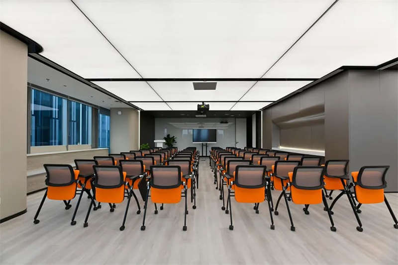 設(shè)計(jì)團(tuán)隊(duì)特意選擇了一處大型開(kāi)敞的臨窗場(chǎng)地,在酷炫的3D裸眼展示室旁邊打造出了一個(gè)4S店風(fēng)格的培訓(xùn)和茶水的二合一空間,以滿(mǎn)足客戶(hù)快速發(fā)展的團(tuán)隊(duì)培訓(xùn)和新品發(fā)布的需求。在臨幕墻的位置,設(shè)計(jì)師原來(lái)就設(shè)計(jì)了一排沿窗的休閑階梯造型臺(tái)階,后來(lái)因?yàn)橐咔榉揽氐男枨?,把臺(tái)階內(nèi)的空間利用好,平時(shí)內(nèi)部可以?xún)?chǔ)藏睡袋,防疫物資,帳篷等物品。