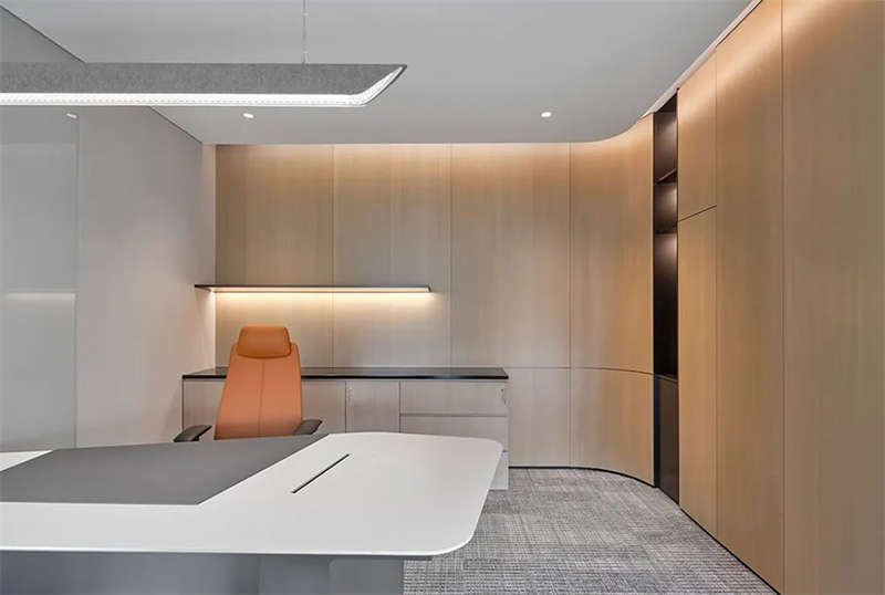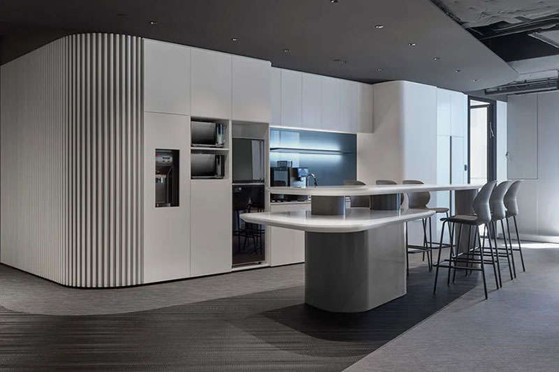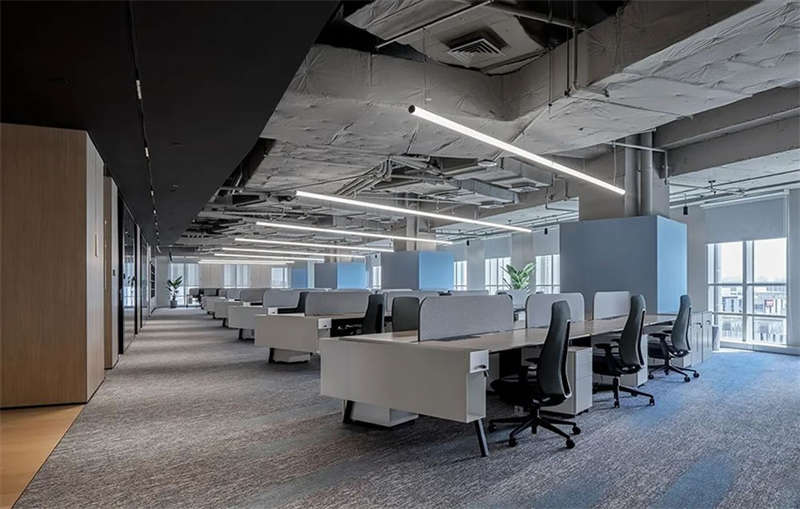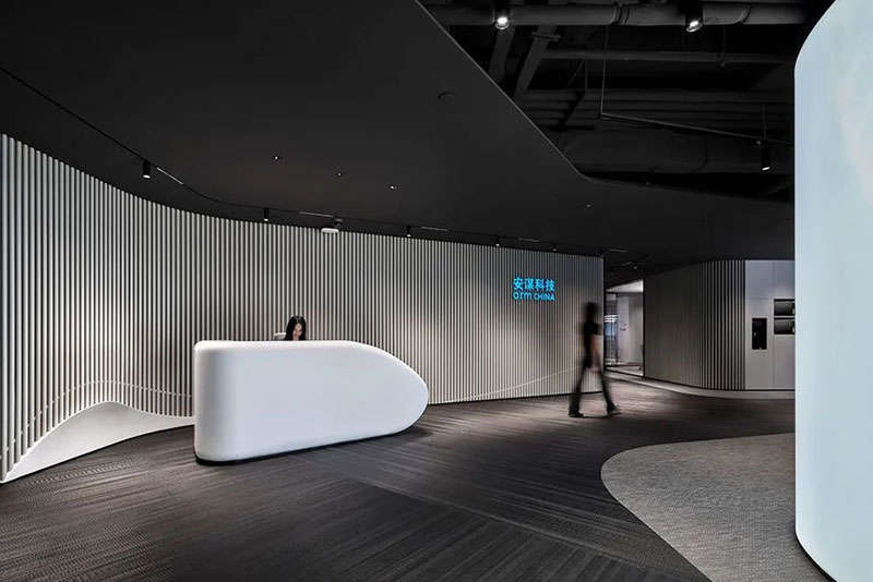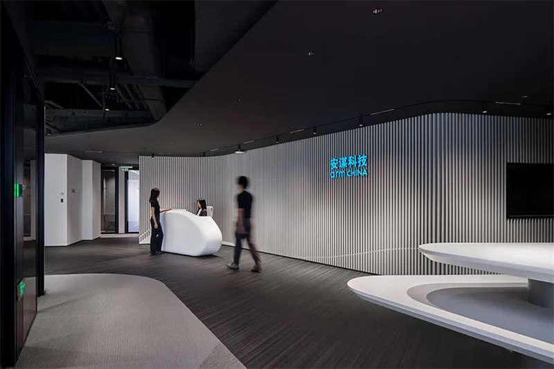 穿過(guò)會(huì)議區(qū)進(jìn)入開(kāi)放辦公區(qū)闊然開(kāi)朗,色調(diào)由黑變淺,層層律動(dòng)的地面紋理將蔚藍(lán)海洋天空的自然氣息引入到空間,律動(dòng)的線性燈光交織輝映描述了Arm科技之源越過(guò)海洋略過(guò)山川的偉大之旅,植物和木色的點(diǎn)綴讓空間賦予對(duì)自然和科技的尊崇和平衡。