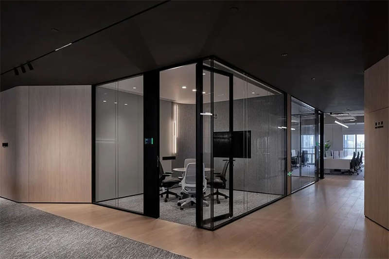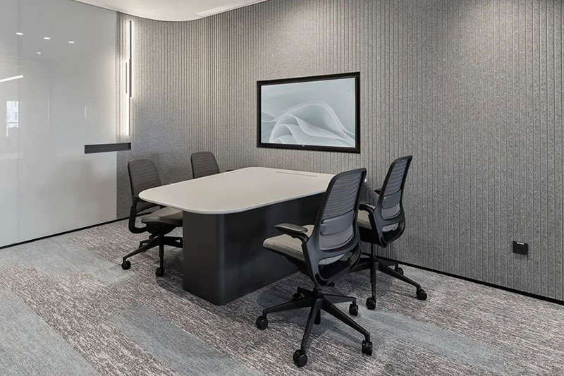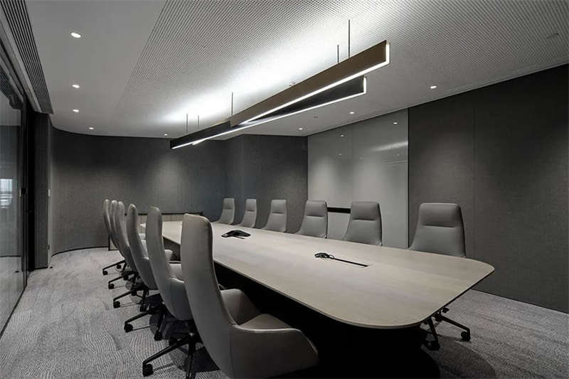 進(jìn)入會(huì)議空間,設(shè)計(jì)師刻意控制它的視覺(jué)張力,前區(qū)的體驗(yàn)得以延續(xù),灰黑色調(diào)覆蓋目力所及并引入更多的柔性材料,專(zhuān)業(yè)、專(zhuān)注是會(huì)議空間的功能立本但也不乏我們對(duì)活力元素的照拂,每一個(gè)會(huì)議室我們都選擇了形式各樣的藍(lán)色地毯來(lái)裝點(diǎn)。