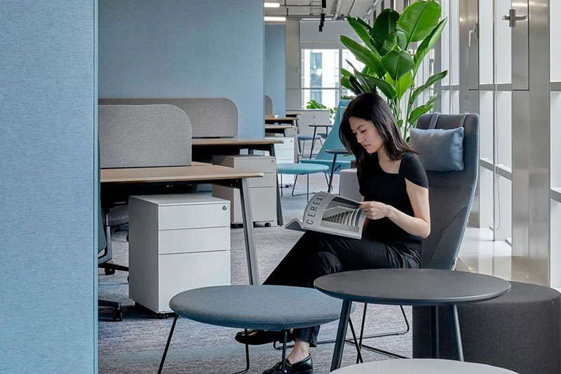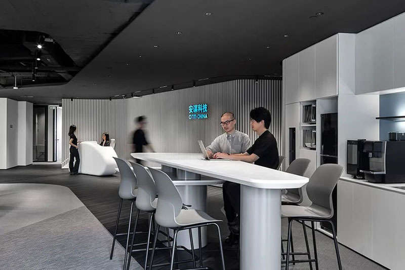 入戶的觀感尤為純粹,由一面數(shù)碼互動(dòng)墻將視覺(jué)由電梯廳引入內(nèi)部,極致的暗調(diào)勾勒出明快的線性淺灰色logo墻并有向上延伸之感,自發(fā)光logo猶如秘境中的湛藍(lán)熒光寶石恬靜而自信的展現(xiàn)自我,黑色Bolon毯紋理隨著視覺(jué)的變化不斷變幻伴隨空間動(dòng)線,將訪客緩緩引入內(nèi)場(chǎng)直達(dá)休憩區(qū),猶如數(shù)字科技傳動(dòng)向前并引領(lǐng)未來(lái)。此處形式多樣的家具配合綠樹(shù)盈動(dòng),構(gòu)造了訪客和員工之間交融和平衡的靈動(dòng)空間。