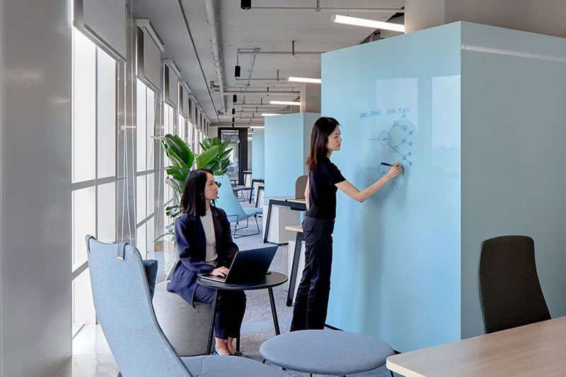 由于建筑不是專(zhuān)業(yè)寫(xiě)字樓,全開(kāi)放的租賃面積、過(guò)大的柱體、凌亂的工業(yè)管道天花也給設(shè)計(jì)提出了難題。為了平衡好行政辦公和會(huì)客及不同部門(mén)之間的功能分區(qū),設(shè)計(jì)師把打印、咖啡、小洽談休憩空間作為功能島置入整層的正中,合理分隔東西兩個(gè)工區(qū)并方便大家便捷使用。沿窗的柱體通過(guò)裝飾面的包裹和扭轉(zhuǎn)形成空間亮點(diǎn),輔以休閑家具,簡(jiǎn)短的洽談分享、小的會(huì)議討論在此得以解決,員工在介于室內(nèi)空間和自然窗光中獲得了獨(dú)特的體驗(yàn)和助益。