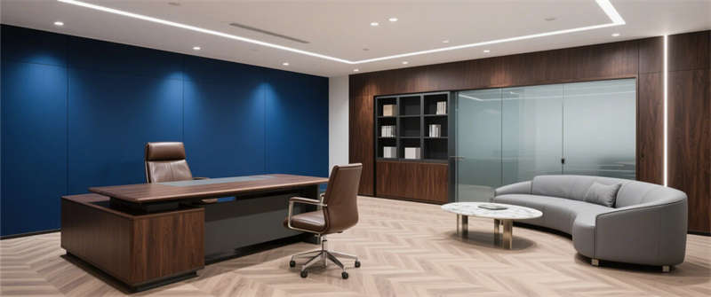 總裁辦公室:人字拼木地板與深胡桃木家具提升質(zhì)感,深藍(lán)藝術(shù)漆背景墻強(qiáng)化品牌識(shí)別;