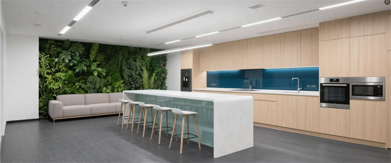 休閑茶水間:白色吧臺(tái)與綠植墻營(yíng)造松弛氛圍,地膠材質(zhì)耐磨易清潔。