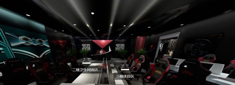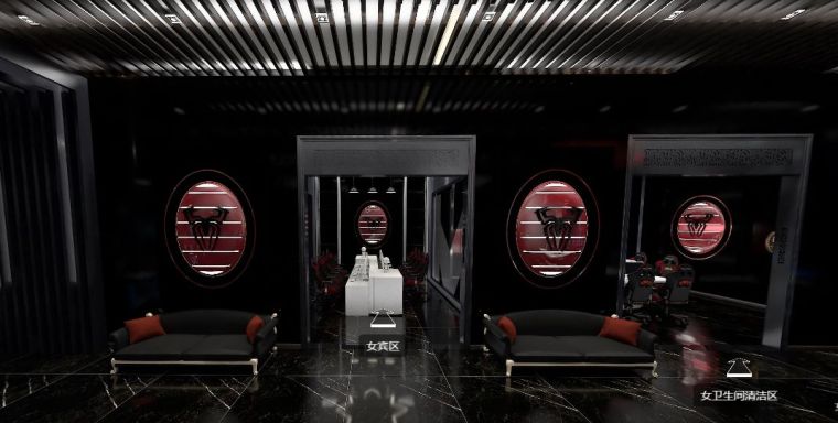 在迎賓區(qū)兩邊,左右分布著男賓區(qū)和女賓區(qū)。相較于普通網(wǎng)咖設(shè)計(jì),電競會館具有賽事承辦上的專業(yè)特色,為了使人更加有比賽所需專注,男賓區(qū)墻面只有簡單的涂鴉,飾物元素也極少,相較于男賓區(qū)設(shè)計(jì)較為簡單,女賓區(qū)“紅蜘蛛”主題感十足,頂墻燈光合理搭配來減少黑色來的的壓抑感。男女獨(dú)立衛(wèi)生間分別分布在兩個區(qū)域,非常人性化。