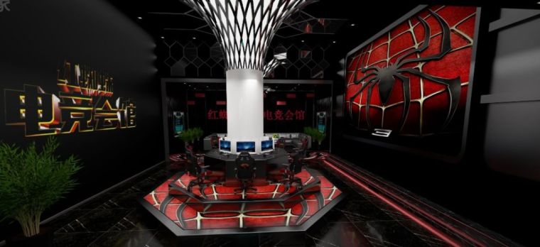 從迎賓區(qū)直接進(jìn)入后,來到最為核心的競技比賽區(qū),滿足電競游戲里開黑等座位聚集需要,非常創(chuàng)意性地在空間中加入了圓柱設(shè)計(jì),空間里最大亮點(diǎn)是圓柱臺有規(guī)律交錯的線條與“紅蜘蛛”背景墻交相呼應(yīng),打造了成為了“蜘蛛網(wǎng)”的元素,讓整個核心空間與主題完美契合。