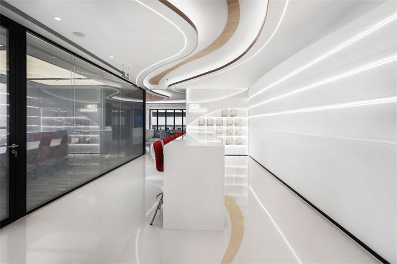 整個空間呈現(xiàn)出輕盈的姿態(tài),大面積留白給予空間呼吸感,曲線流動的造型就像一根善于變化而纖細(xì)不驚的絲線,即將牽引出一次次關(guān)于未來的探索。