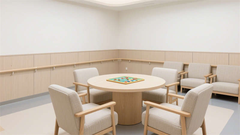 本設(shè)計(jì)聚焦養(yǎng)老院室內(nèi)空間的適老化需求與現(xiàn)代審美融合,從居住者的實(shí)際生活場景出發(fā),打造兼具安全性與舒適度的環(huán)境。在公共活動(dòng)區(qū)域,采用無高差地面設(shè)計(jì),搭配防滑耐磨的地面材質(zhì),避免老人行走時(shí)發(fā)生磕碰或滑倒;墻面安裝便于抓握的扶手,扶手高度與間距經(jīng)過精心考量,貼合老人起身、行走時(shí)的支撐需求,同時(shí)扶手外觀融入現(xiàn)代簡約線條,不顯突兀。?